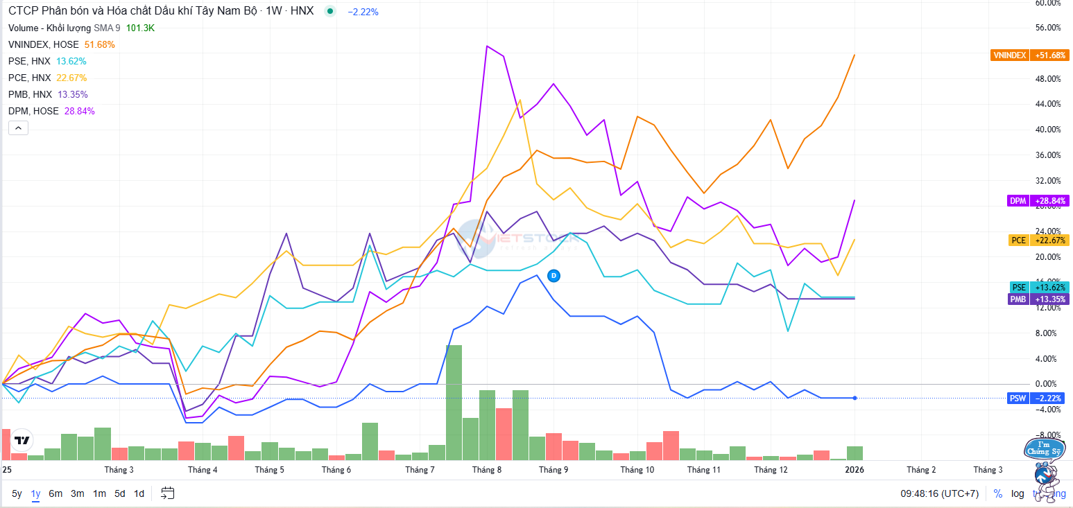 Trên thị trường chứng khoán, trong vòng 1 năm qua, cổ phiếu DPM cùng 3 công ty con gồm PCE, PSE và PMB ghi nhận mức tăng giá lần lượt khoảng 28%, 23%, 14% và 13%. Riêng PSW là mã duy nhất giảm hơn 2% trong cùng kỳ. Dù vậy, cả 5 cổ phiếu này đều có mức tăng thấp hơn đáng kể so với mức tăng gần 52% của chỉ số VN-Index trong 1 năm qua.