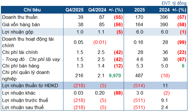 Quý 4/2025, ABS đạt doanh thu chỉ 39 tỷ đồng, “bốc hơi” 55% so với cùng kỳ. Dù giá vốn giảm tương ứng, lãi gộp vẫn chỉ còn khoảng 1 tỷ đồng, giảm 5%.
