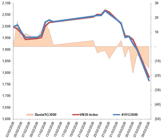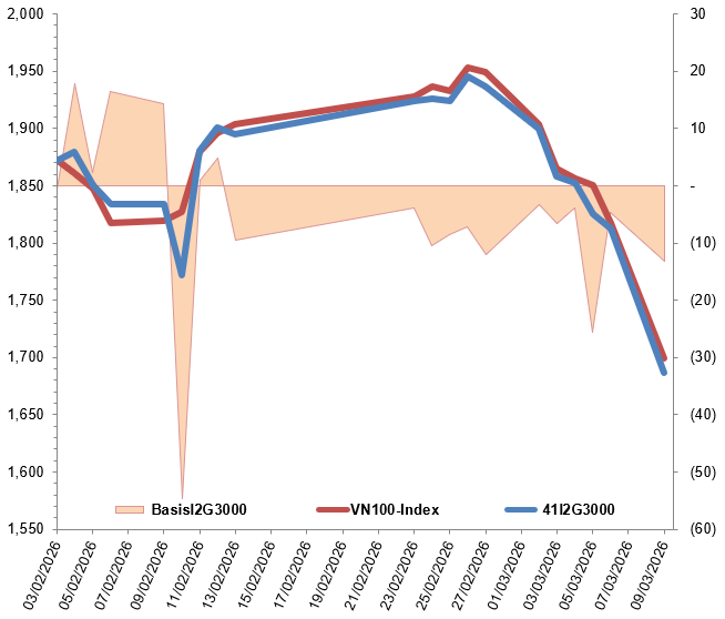 Ngoài ra, các hợp đồng tương lai VN100 đồng loạt giảm điểm trong phiên giao dịch ngày 09/03/2026. Cụ thể, 41I2G3000 (I2G3000) giảm 6.99%, còn 1,686.4 điểm; 41I2G4000 (I2G4000) giảm 6.7%, còn 1,695.9 điểm; hợp đồng 41I2G6000 (I2G6000) giảm 6.98%, còn 1,669.8 điểm; hợp đồng 41I2G9000 (I2G9000) giảm 7%, còn 1,701.6 điểm. Chỉ số cơ sở VN100-Index kết phiên ở mức 1,699.6 điểm.