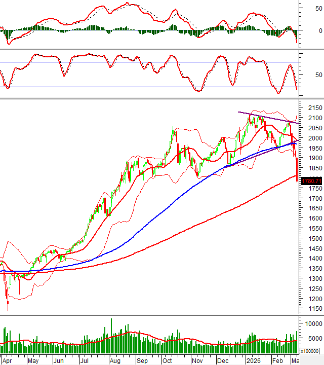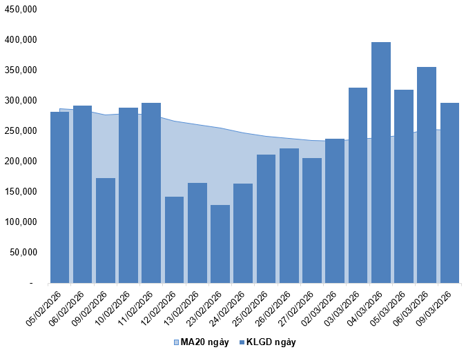 Trong phiên giao dịch ngày 09/03/2026, VN30-Index giảm điểm 7 phiên liên tiếp đồng thời xuất hiện mẫu hình nến Big Black Candle kèm theo khối lượng giao dịch gia tăng và vượt mức trung bình 20 phiên cho thấy tâm lý bi quan của nhà đầu tư.