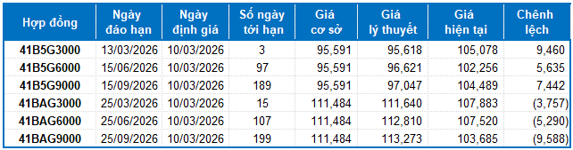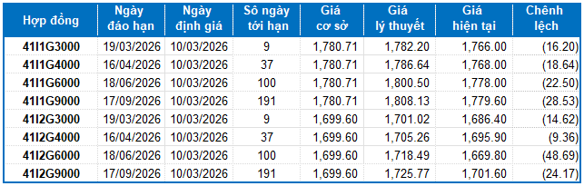Dựa trên phương pháp định giá hợp lý với thời điểm khởi đầu ngày 10/03/2026, khung giá hợp lý của các hợp đồng tương lai đang được giao dịch trên thị trường được thể hiện như sau: