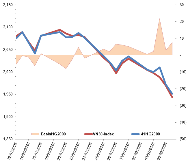 Các hợp đồng tương lai VN30 đồng loạt giảm điểm trong phiên giao dịch ngày 06/02/2026. Cụ thể, 41I1G2000 (I1G2000) giảm 1.06%, còn 1,951.3 điểm; 41I1G3000 (I1G3000) giảm 1.13%, còn 1,952.6 điểm; hợp đồng 41I1G6000 (I1G6000) giảm 0.84%, còn 1,953.5 điểm; hợp đồng 41I1G9000 (I1G9000) giảm 1.05%, còn 1,954 điểm. Chỉ số cơ sở VN30-Index kết phiên ở mức 1,943.6 điểm.