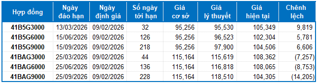 Dựa trên phương pháp định giá hợp lý với thời điểm khởi đầu ngày 09/02/2026, khung giá hợp lý của các hợp đồng tương lai đang được giao dịch trên thị trường được thể hiện như sau: