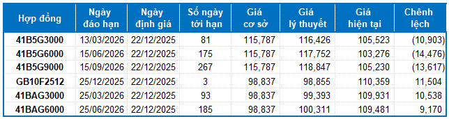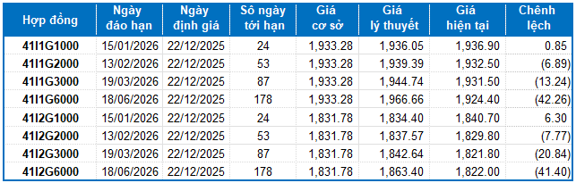 Dựa trên phương pháp định giá hợp lý với thời điểm khởi đầu ngày 22/12/2025, khung giá hợp lý của các hợp đồng tương lai đang được giao dịch trên thị trường được thể hiện như sau: