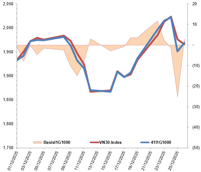 Các hợp đồng tương lai VN30 hầu hết đều giảm trong phiên giao dịch ngày 26/12/2025. Cụ thể, 41I1G1000 (I1G1000) tăng 0.97%, đạt 1,969 điểm; 41I1G2000 (I1G2000) giảm 0.91%, còn 1,970 điểm; hợp đồng 41I1G3000 (I1G3000) giảm 0.74%, còn 1,965 điểm; hợp đồng 41I1G6000 (I1G6000) giảm 1.72%, còn 1,946 điểm. Chỉ số cơ sở VN30-Index kết phiên ở mức 1,965.97 điểm.