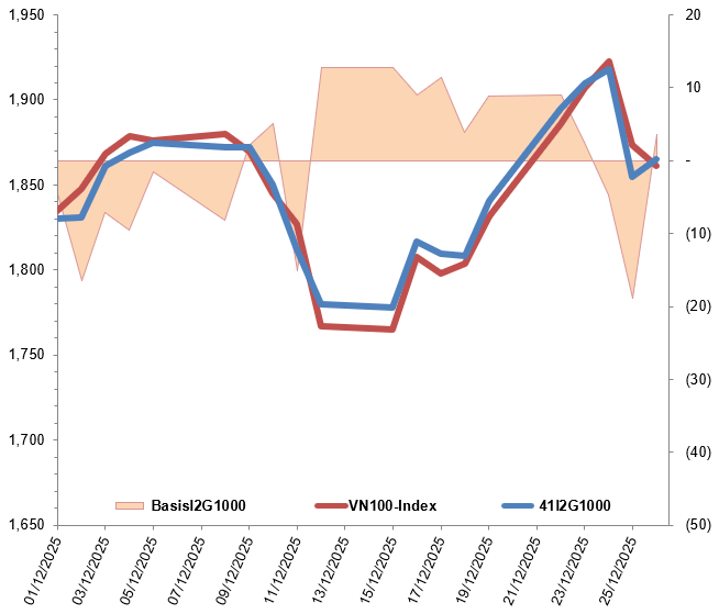 Ngoài ra, các hợp đồng tương lai VN100 đồng loạt giảm điểm trong phiên giao dịch ngày 26/12/2025. Cụ thể, 41I2G1000 (I2G1000) giảm 0.38%, còn 1,865.1 điểm; 41I2G2000 (I2G2000) giảm 1.83%, còn 1,865 điểm; hợp đồng 41I2G3000 (I2G3000) giảm 1.85%, còn 1,855 điểm; hợp đồng 41I2G6000 (I2G6000) giảm 1.81%, còn 1,846 điểm. Chỉ số cơ sở VN100-Index kết phiên ở mức 1,861.57 điểm.