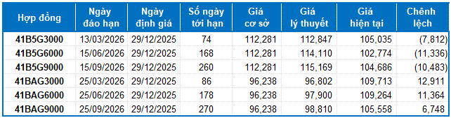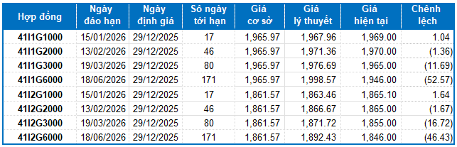 Dựa trên phương pháp định giá hợp lý với thời điểm khởi đầu ngày 29/12/2025, khung giá hợp lý của các hợp đồng tương lai đang được giao dịch trên thị trường được thể hiện như sau: