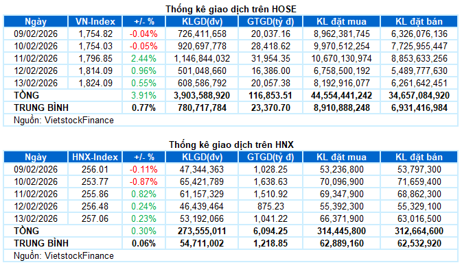 Giao dịch: Các chỉ số chính duy trì đà tăng trong phiên giao dịch ngày 13/02. VN-Index tăng 0.55%, lên mức 1,824.09 điểm; HNX-Index cũng tăng 0.23%, đạt 257.06 điểm. Xét cho cả tuần, VN-Index có thêm tổng cộng 68.6 điểm (+3.91%), còn HNX-Index tăng nhẹ 0.78 điểm (+0.3%).