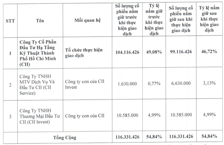 CTCP Đầu tư Hạ tầng Kỹ thuật Thành phố Hồ Chí Minh (HOSE: CII) thông báo sẽ chuyển nhượng 5 triệu cp đang sở hữu tại CTCP Đầu tư Cầu đường CII (HOSE: LGC) cho công ty cháu là Công ty TNHH MTV Dịch vụ và Đầu tư CII (CII Service).