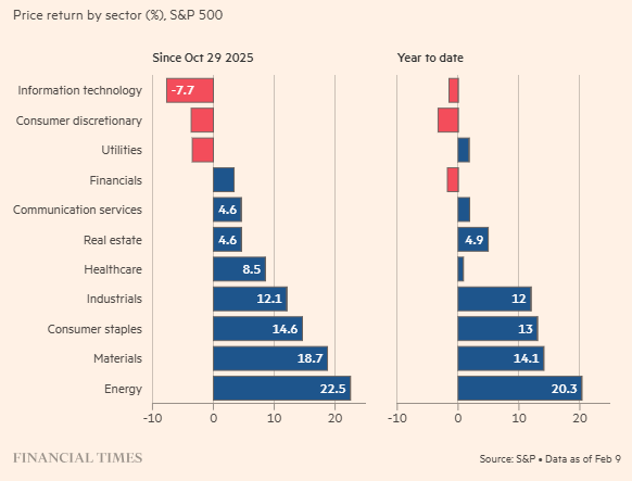 Làn sóng di chuyển vốn này đã hồi sinh những ngành từng bị "bỏ quên", đồng thời khiến nhiều công ty công nghệ - những ngôi sao năm ngoái - gặp khó khăn khi cơn sốt AI tạm lắng và lo ngại về tác động của trí tuệ nhân tạo (AI) lên ngành phần mềm ngày càng gia tăng.