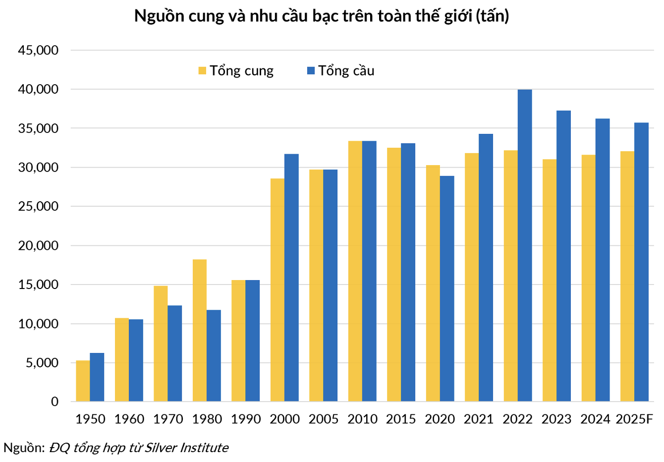 Thị trường bạc đã rơi vào tình trạng cung không đủ cầu trong 5 năm liên tiếp, từ 2021 đến 2025. Các kho dự trữ trên mặt đất đang cạn kiệt nhanh chóng, đẩy thị trường vào tình trạng khan hiếm vật chất thực sự.