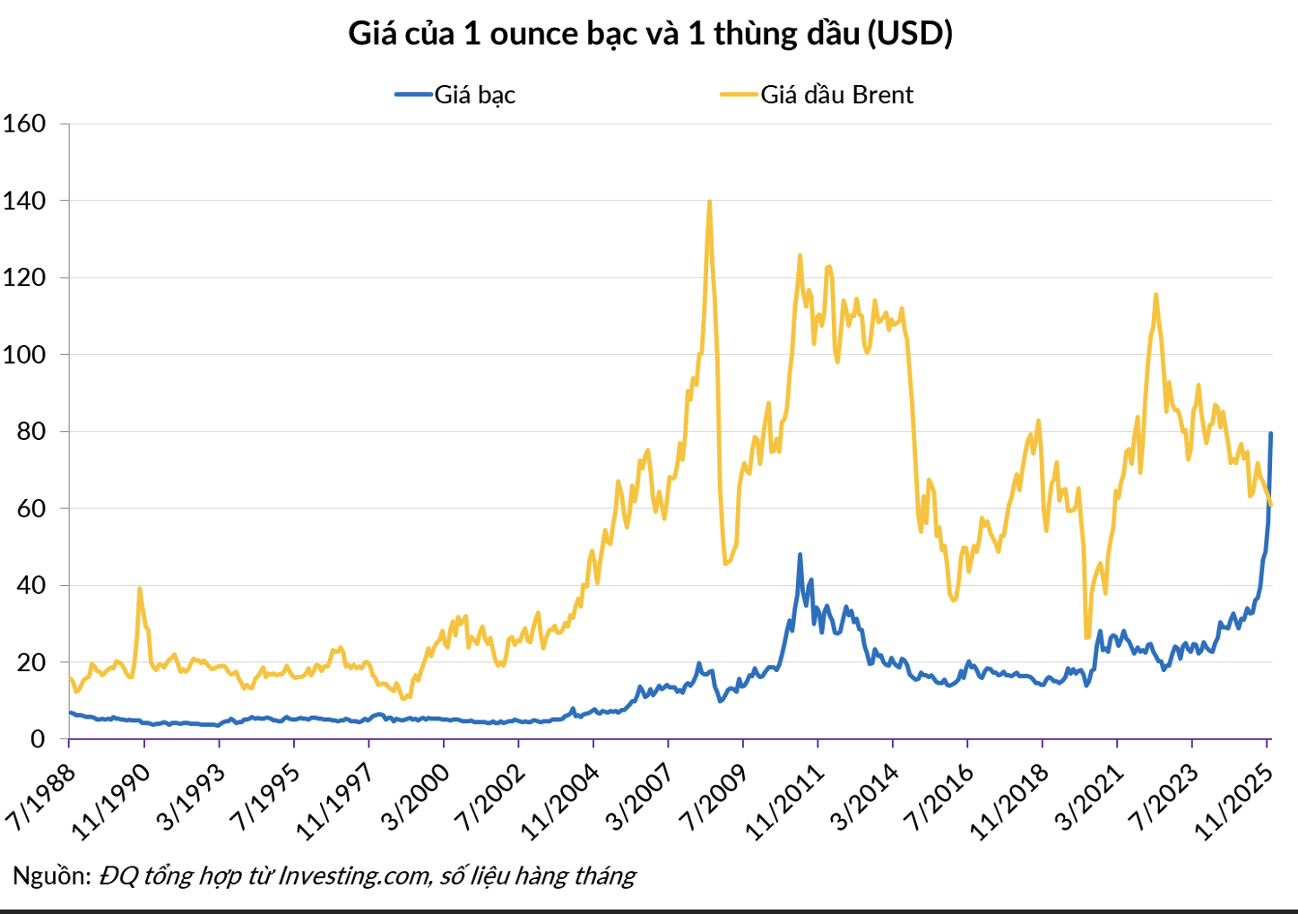 Trong suốt thế kỷ 20, dầu mỏ được mệnh danh là "Vàng đen", là thước đo quyền lực địa chính trị và sức khỏe kinh tế toàn cầu. Tuy nhiên khi năm 2025 khép lại, một thực tế mới đã được xác lập. Trong khi giá dầu thô WTI chật vật quanh ngưỡng 60-65 USD/thùng do tình trạng dư cung kinh niên, thì giá bạc đã thực hiện cú bứt phá ngoạn mục lên đỉnh lịch sử 80 USD/ounce.