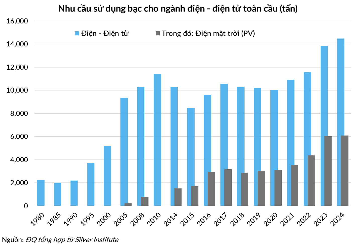 Theo số liệu từ Silver Institute, ngành năng lượng mặt trời (Photovoltaics - PV) đã trở thành một "hố đen" hút bạc, chiếm tới 29% tổng nhu cầu công nghiệp vào năm 2024. Các cam kết Net-Zero của Mỹ, Liên minh Châu Âu và Trung Quốc đã biến nhu cầu bạc trở thành một xu hướng bắt buộc, không phụ thuộc vào giá cả.
