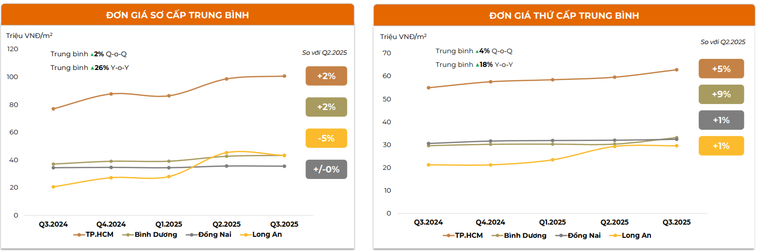 Về giá bán, giá sơ cấp tăng nhẹ 2% tại các đô thị lớn, trong khi giá thứ cấp (mua đi bán lại) ghi nhận đà tăng trưởng rõ rệt, mạnh nhất tại Bình Dương (tăng 9%) và TPHCM (tăng 5%). Dòng tiền đang tập trung mạnh vào các căn hộ 2 phòng ngủ với phân khúc giá 2-3 tỷ đồng tại TPHCM và 1-2 tỷ đồng tại vùng vệ tinh.