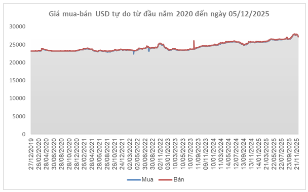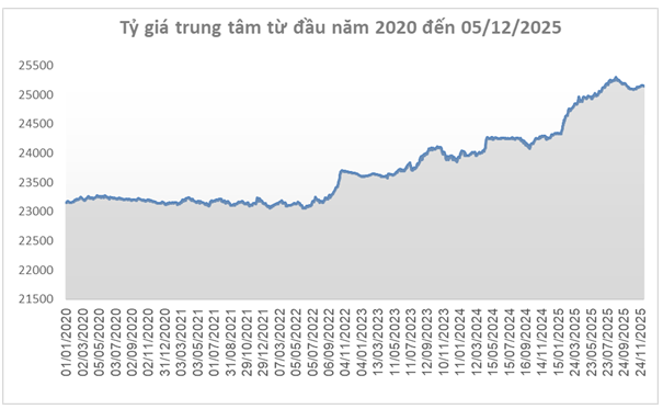 Trong nước, tỷ giá USD/VND cũng quay đầu giảm nhẹ sau chuỗi tăng kéo dài một tháng. Ngày 05/12, tỷ giá trung tâm do Ngân hàng Nhà nước công bố ở mức 25,151 đồng/USD, giảm 4 đồng so với cuối tuần trước. Với biên độ ±5%, tỷ giá tại các ngân hàng thương mại được phép dao động trong vùng 23,893 – 26,409 đồng/USD.