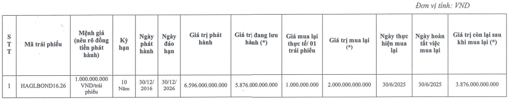 Tính đến đầu năm 2025, giá trị trái phiếu lưu hành còn 5,876 tỷ đồng. Cuối tháng 6/2025, HAG đã mua lại trước hạn một phần lô trái phiếu này, giá trị mua 2 ngàn tỷ đồng, giảm dư nợ lô này về 3,876 tỷ đồng.