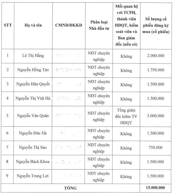 Danh sách đăng ký mua có 9 nhà đầu tư. Trong đó, Tổng Giám đốc kiêm Thành viên HĐQT Nguyễn Văn Quân dự kiến mua nhiều nhất với 3 triệu cp; tiếp theo là 2 nhà đầu tư cá nhân - bà Lê Thị Hằng dự kiến mua 2 triệu cp và ông Nguyễn Hồng Tảo dự kiến mua 1.75 triệu cp.