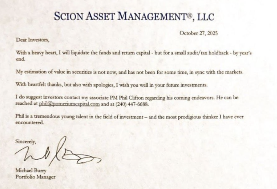 Theo cơ sở dữ liệu của Ủy ban Chứng khoán và Giao dịch Mỹ (SEC), trạng thái đăng ký của quỹ Scion đã chuyển sang "chấm dứt" (terminated) từ ngày 10/11. Động thái này đồng nghĩa với việc quỹ sẽ không còn phải nộp báo cáo cho cơ quan quản lý hay bất kỳ tiểu bang nào.