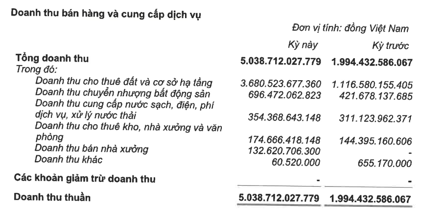 Lũy kế 9 tháng, doanh thu thuần gần 5,039 tỷ đồng, lãi sau thuế gần 1,563 tỷ đồng, gấp 2.5 và 3.9 lần cùng kỳ. Động lực đến từ hoạt động cho thuê đất và cơ sở hạ tầng KCN hơn 3,680 tỷ đồng, gấp 3.3 lần; chuyển nhượng bất động sản hơn 696 tỷ đồng, tăng 65% và phát sinh gần 133 tỷ đồng từ việc bán nhà xưởng.