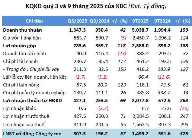 Báo cáo tài chính quý 3/2025 của Tổng Công ty Phát triển Đô thị Kinh Bắc - CTCP (HOSE: KBC) vừa công bố cho thấy, doanh thu thuần ghi nhận hơn 1,347 tỷ đồng, lãi ròng hơn 307 tỷ đồng, tăng lần lượt 42% và 57% so với cùng kỳ.
