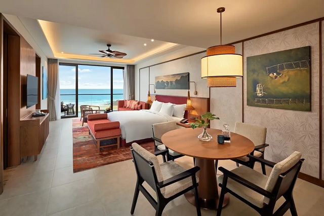 Căn phòng được trang bị giường đôi cỡ lớn êm ái, ban công riêng hướng ra biển, cùng phòng tắm sang trọng với bồn tắm riêng và khu vực sinh hoạt chung thoải mái. Từng chi tiết trong phòng đều được chăm chút tỉ mỉ, mang lại cho du khách cảm giác thư giãn và riêng tư tuyệt đối giữa khung cảnh biển trời bao la.