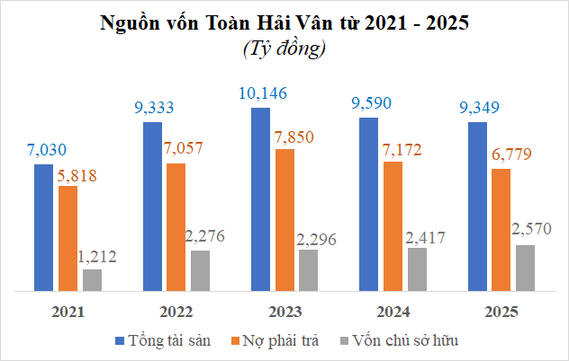 Tổng tài sản Toàn Hải Vân thời điểm cuối 2025 đạt 9,349 tỷ đồng, giảm 3% so với đầu năm. Vốn chủ sở hữu tăng 6% lên hơn 2,570 tỷ đồng, nhờ vốn điều lệ tăng thêm 145 tỷ đồng lên hơn 2,467 tỷ đồng. Trong đó, lợi nhuận sau thuế chưa phân phối gần 102 tỷ đồng.