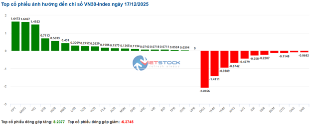 | Top 10 cổ phiếu tác động mạnh tới VN-Index phiên sáng 17/12/2025 (tính theo điểm) | ||