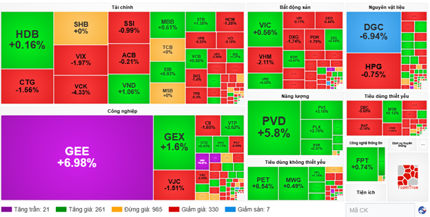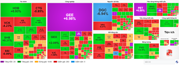 Bên cạnh đó, các nhóm công nghiệp và tiêu dùng không thiết yếu cũng giao dịch sôi động với các điểm sáng như GEE, HID cùng SHI tăng hết biên độ, GEX (-1.6%), VTP (+2.62%), BMP (+4.73%); PET (+6.54%), VPL (+1.78%), FRT (+1.78%) và TTF (+1.82%). Tuy nhiên, vẫn có không ít cổ phiếu đang ghi nhận sự điều chỉnh cao, bao gồm VJC (-1.51%), CII (-1.65%), PC1 (-0.89%), HVN (-1.84%); HUT (-1.21%), PNJ (-0.97%), DGW (-1.12%), C69 (-1.55%) và TTG (-3.81%).