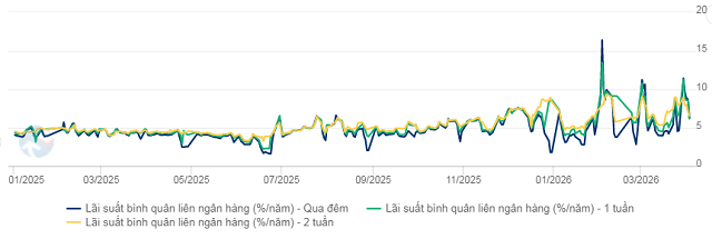 Động thái trên diễn ra trong bối cảnh lãi suất liên ngân hàng tăng vọt ở các kỳ hạn ngắn. Lãi suất qua đêm chạm 11.42% trong phiên 30/03, trước khi hạ nhiệt và kết tuần ở mức 6.29%, tăng 166 điểm cơ bản so với tuần trước. Các kỳ hạn 1 tuần và 2 tuần cũng ghi nhận diễn biến tương tự: Lần lượt đạt đỉnh 11.27% và 8.94% trong phiên 30/03, sau đó giảm về 6.16% và 6.56% vào cuối tuần.