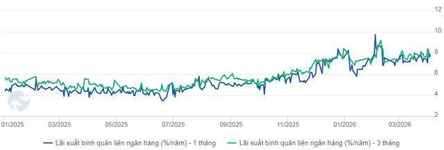 Ở nhóm kỳ hạn dài, lãi suất 1 tháng và 3 tháng có xu hướng giảm về cuối tháng 3, sau đó bật tăng trở lại vào đầu tháng 4, có thời điểm vượt 8% trước khi lùi về quanh ngưỡng trên 7% vào cuối tuần.