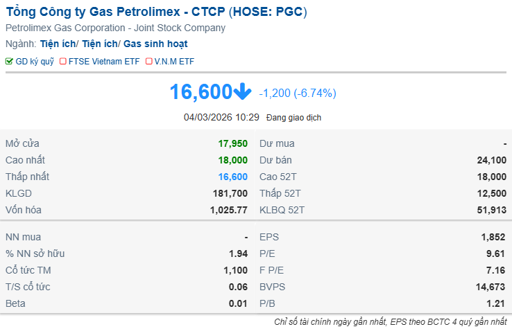 Ngày 02/03, MB Capital cùng quỹ thành viên là MBVF đồng loạt đăng ký bán lượng lớn cổ phiếu đang nắm giữ tại Tổng Công ty Gas Petrolimex - CTCP (HOSE: PGC), sau khi thị giá tăng mạnh giữa lúc xung đột leo thang tại Trung Đông. Tuy nhiên, PGC hiện đang giảm sàn trong phiên sáng 04/03, không lâu sau thông báo của nhóm MB Capital.