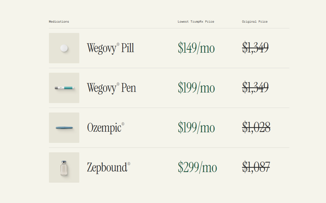 Tại thời điểm ra mắt trang web, chính quyền đã liệt kê một loạt các loại thuốc quan trọng có sẵn và sẽ bán giảm giá, với sự nhấn mạnh đặc biệt vào các sản phẩm GLP-1 phổ biến:
