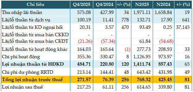 So với mục tiêu lợi nhuận trước thuế 716 tỷ đồng năm 2025, Ngân hàng đã vượt 7% kế hoạch.