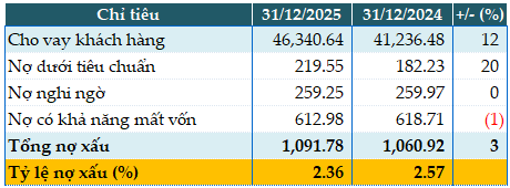 Tổng nợ xấu của PGBank tính đến 31/12/2025 xấp xỉ đầu năm, ở mức 1,092 tỷ đồng. Tỷ lệ nợ xấu/dự nợ vay giảm từ mức 2.57% đầu năm xuống còn 2.36%.