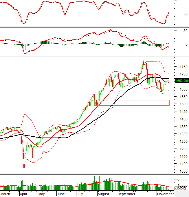 Tuy nhiên, chỉ số tiếp tục nằm trên đường Middle của Bollinger Bands và Stochastic Oscillator, MACD cùng cho tín hiệu mua trở lại nên triển vọng ngắn hạn khá tích cực.
