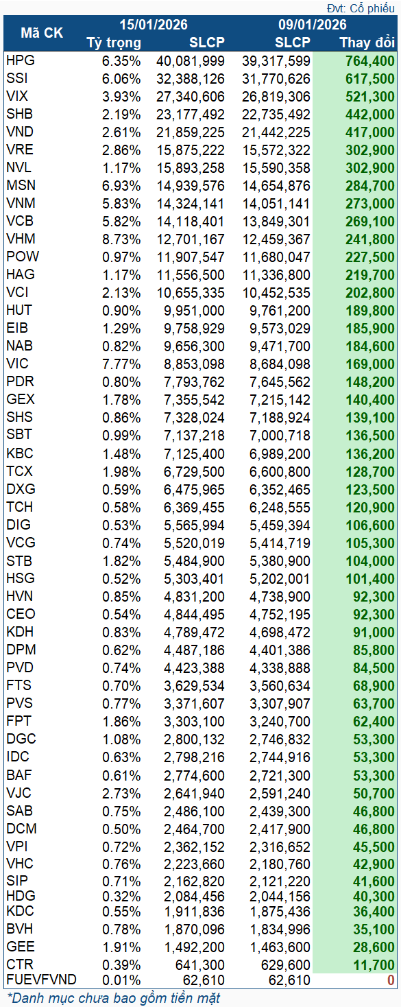 Các thay đổi cổ phiếu quỹ VNM ETF trong giai đoạn 09-15/01/2026