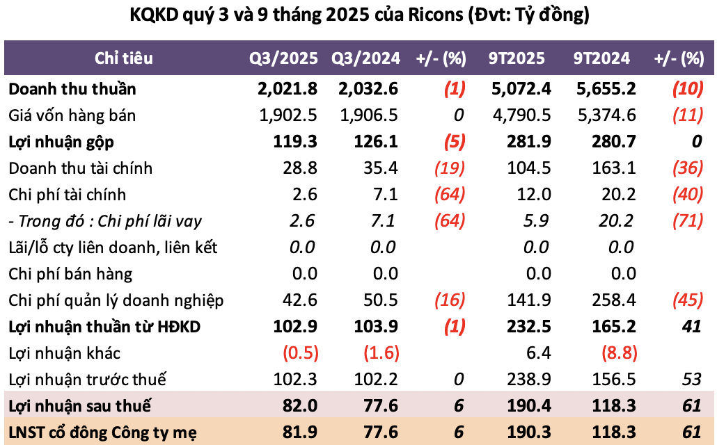 Dù doanh thu hợp đồng xây dựng và bất động sản chững lại, Ricons vẫn lãi ròng 9 tháng gần 200 tỷ đồng, tăng 61% so với cùng kỳ nhờ tiết giảm chi phí. Thực hiện 95% kế hoạch lợi nhuận năm.