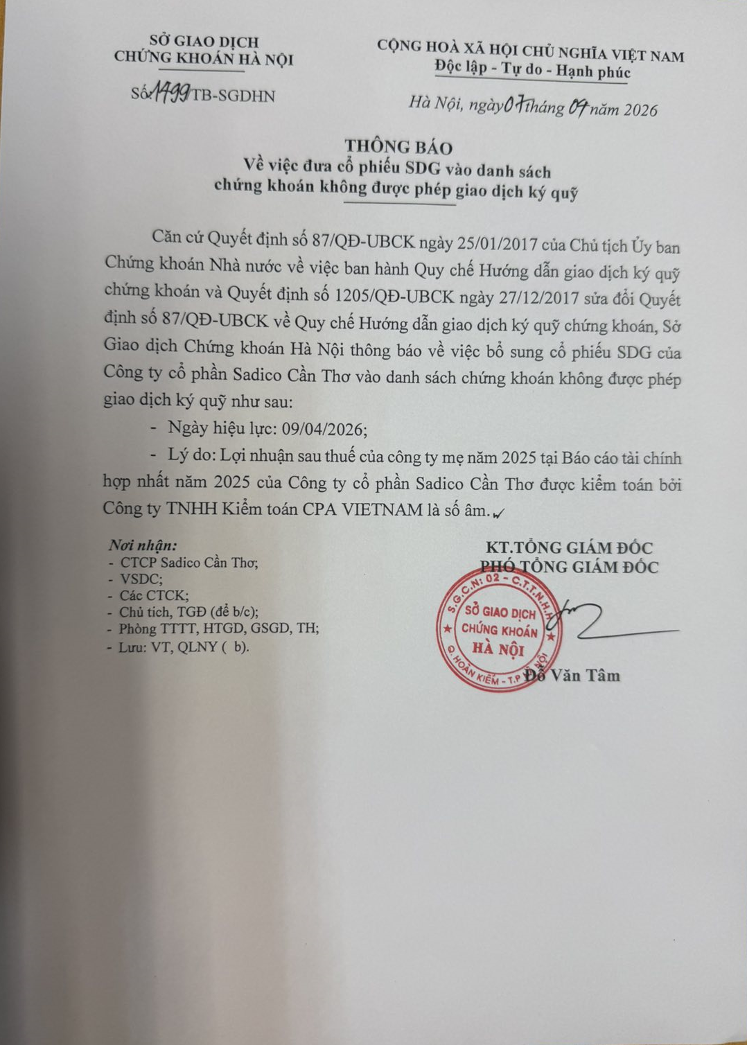 SDG: Đưa cổ phiếu vào danh sách chứng khoán không được phép giao dịch ký quỹ
