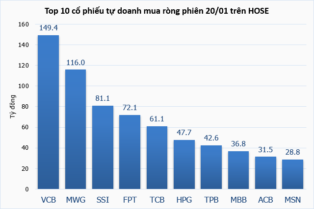 Tự doanh công ty chứng khoán mua ròng hơn 742 tỷ đồng trong phiên 20/01. Đứng đầu danh sách là VCB với quy mô hơn 149 tỷ đồng, tiếp đến là MWG với 116 tỷ đồng.