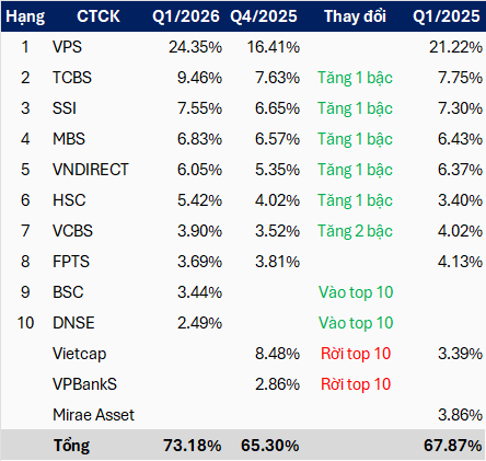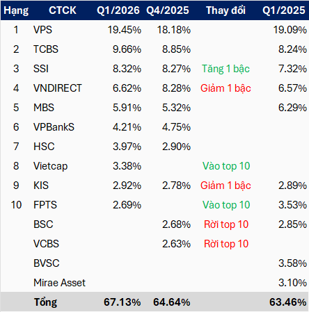 Diễn biến này mở ra cơ hội lớn cho các công ty khác chiếm lấy thị phần. Nhờ đó, VPS tăng mạnh thị phần từ 16.41% lên 24.35% để giữ vững vị thế số một. Tiếp đến, TCBS, SSI, MBS, VNDIRECT, HSC và VCBS đều cải thiện kết quả.