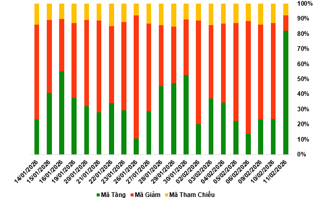 Kết thúc phiên giao dịch ngày 11/02/2026, toàn thị trường có 265 mã tăng, 37 mã giảm và 21 mã tham chiếu.
