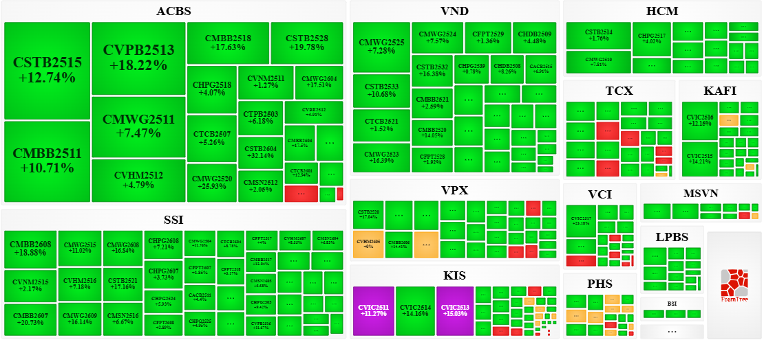 Trong phiên giao dịch ngày 11/02/2026, bên mua quay lại áp đảo thị trường khiến phần lớn các mã chứng quyền tăng giá. Cụ thể, các mã chứng quyền lớn trong nhóm tăng giá là CSTB2515, CMBB2511, CVPB2513, CMWG2511 và CVHM2512.