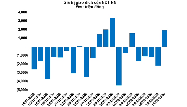 Kết thúc phiên giao dịch ngày 11/02/2026, toàn thị trường có 265 mã tăng, 37 mã giảm và 21 mã tham chiếu. Khối ngoại quay lại mua ròng với tổng mức mua ròng đạt 1.93 tỷ đồng.