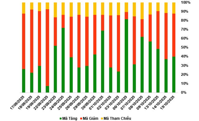 Kết thúc phiên giao dịch ngày 15/10/2025, toàn thị trường có 105 mã tăng, 126 mã giảm và 33 mã tham chiếu.