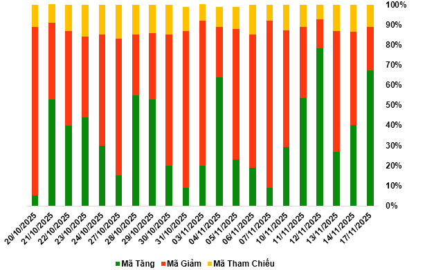 Kết thúc phiên giao dịch ngày 17/11/2025, toàn thị trường có 203 mã tăng, 67 mã giảm và 31 mã tham chiếu.