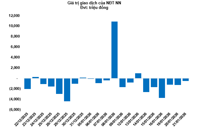 Kết thúc phiên giao dịch ngày 21/01/2026, toàn thị trường có 87 mã tăng, 188 mã giảm và 35 mã tham chiếu. Khối ngoại tiếp tục bán ròng với tổng mức bán ròng đạt 478.86 triệu đồng.