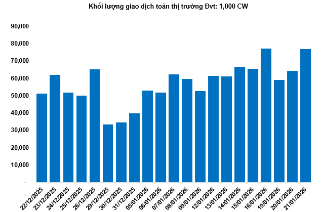 Khối lượng giao dịch toàn thị trường trong phiên 21/01 đạt 77.09 triệu CW, tăng 19.59%; giá trị giao dịch đạt 155.63 tỷ đồng, tăng 19.07% so với phiên 20/01. Trong đó, CMBB2604 là mã dẫn đầu thị trường về khối lượng với 2.4 triệu CW; CSTB2521 dẫn đầu về giá trị giao dịch với 5.47 tỷ đồng.