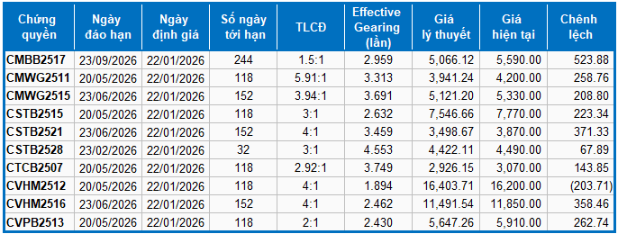 Dựa trên phương pháp định giá phù hợp với thời điểm khởi đầu là ngày 22/01/2026, mức giá hợp lý của 10 chứng quyền có vốn hóa lớn nhất và thanh khoản (giá trị và khối lượng khớp lệnh) vượt trội trong phiên được thể hiện như sau: