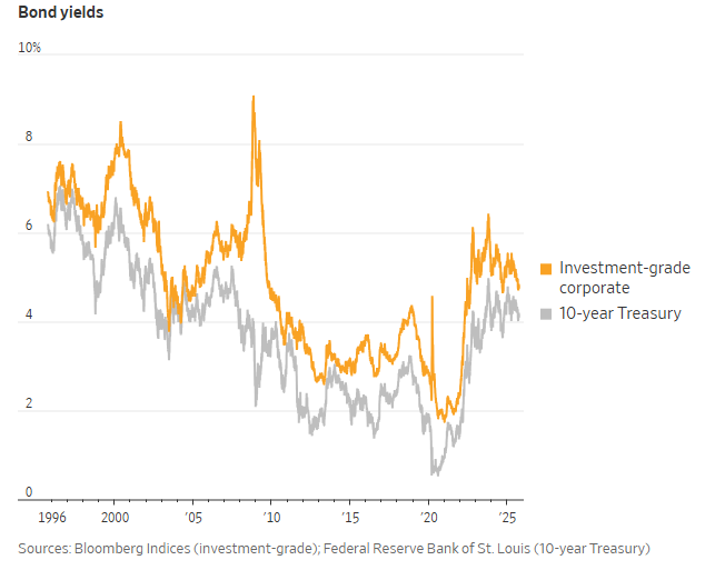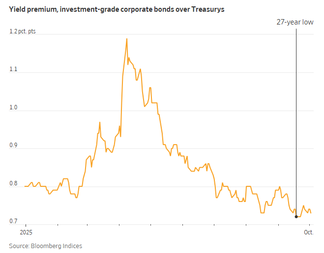 Trong khi S&P 500 vừa đạt kỷ lục thứ 31 của năm 2025 trong ngày 03/10, thì sự phấn khích với trái phiếu doanh nghiệp thậm chí còn đáng chú ý hơn. Theo một số chỉ báo, Phố Wall hiện ít lo ngại về nguy cơ vỡ nợ hay hạ bậc tín nhiệm của các doanh nghiệp hạng đầu tư hơn bất kỳ thời điểm nào khác trong 25 năm qua.