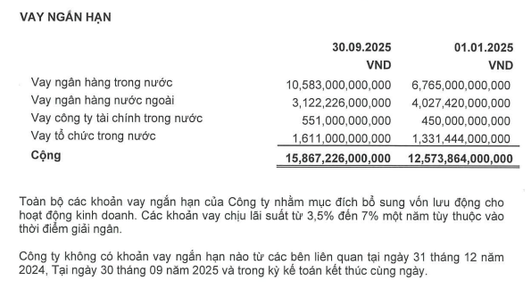 Công ty cho biết toàn bộ các khoản vay ngắn hạn đều nhằm mục đích bổ sung vốn lưu động cho hoạt động kinh doanh, chịu lãi suất 3.5 - 7%/năm tùy thuộc vào thời điểm giải ngân.